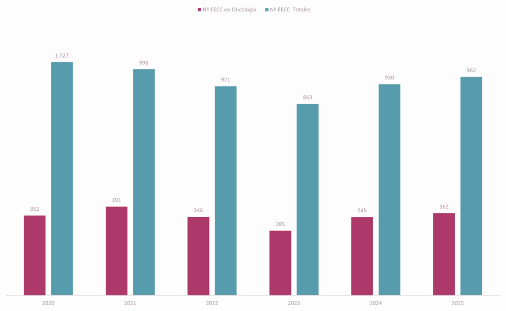 Otra de las buenas noticias es que sigue creciendo el porcentaje de ensayos clínicos en fases tempranas, las más complejas de la investigación, cruciales para determinar si el fármaco es seguro y en las que se muestran indicios de eficacia antes de pasar a estudios a mayor escala. Tener disponibles estos ensayos en fase I y fase II en nuestro país es tratar a pacientes sin opciones terapéuticas con los medicamentos del futuro. Pues bien, más del 72% de los estudios en oncología en el periodo 2020-2025 se iniciaron en fases tempranas, según el Registro Español de Estudios Clínicos (REEC).